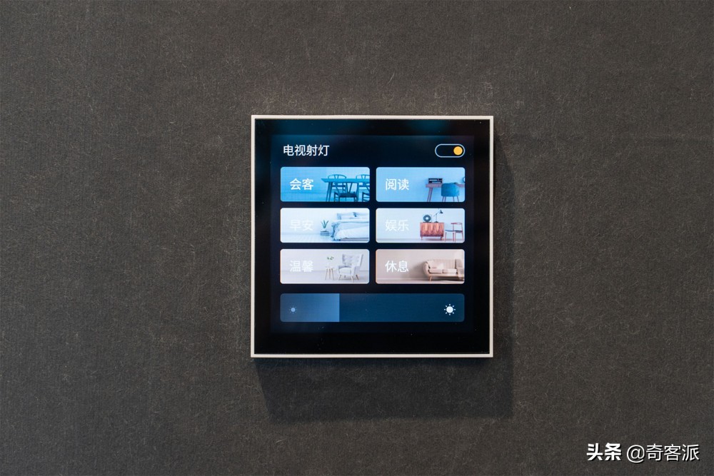 还可以通过这个「超级智能开关」进行触控操作,将上面窗帘的图案推开、关上,很直观的操作,想开多大就开多大。无聊时也是一个解压神器……这个操作方式还可以通过手机APP来实现。